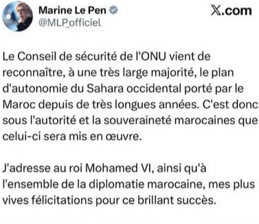 أكدت مارين لوبان في تغريدتها أن “مجلس الأمن التابع للأمم المتحدة اعترف، بأغلبية ساحقة للغاية، بخطة الحكم الذاتي للصحراء التي قدمها المغرب منذ سنوات طويلة”. وشددت على أن هذه الخطة “سيتم تنفيذها تحت السلطة والسيادة المغربية”.